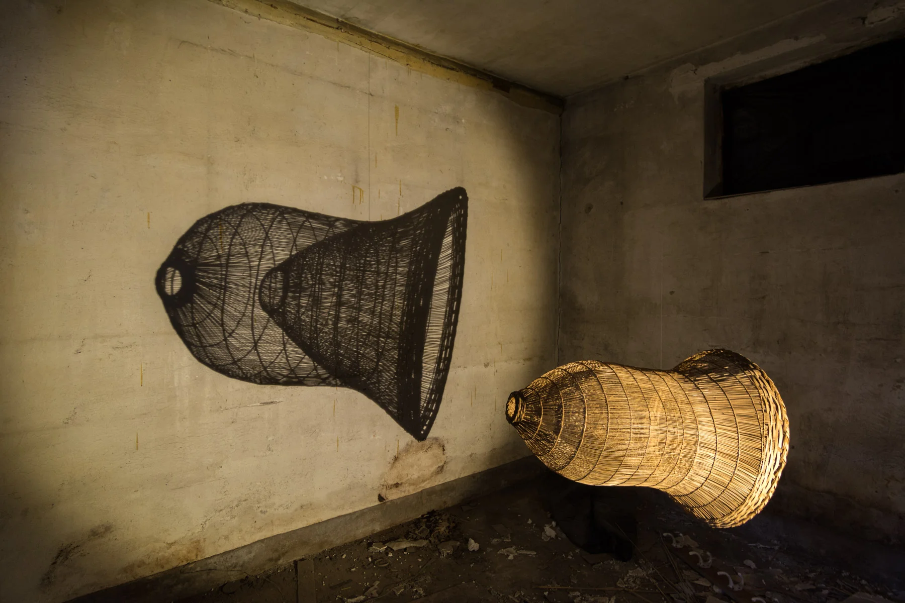 Ω (Omega) is a spatial installation for "The Aliens of Courtyard 23", a group exhibition/collective installation in a run-down courtyard in Baitasi. It uses a handmade bamboo fish trap and an LED spotlight to create a shadow on the wall of the small room, which has otherwise been left untouched.